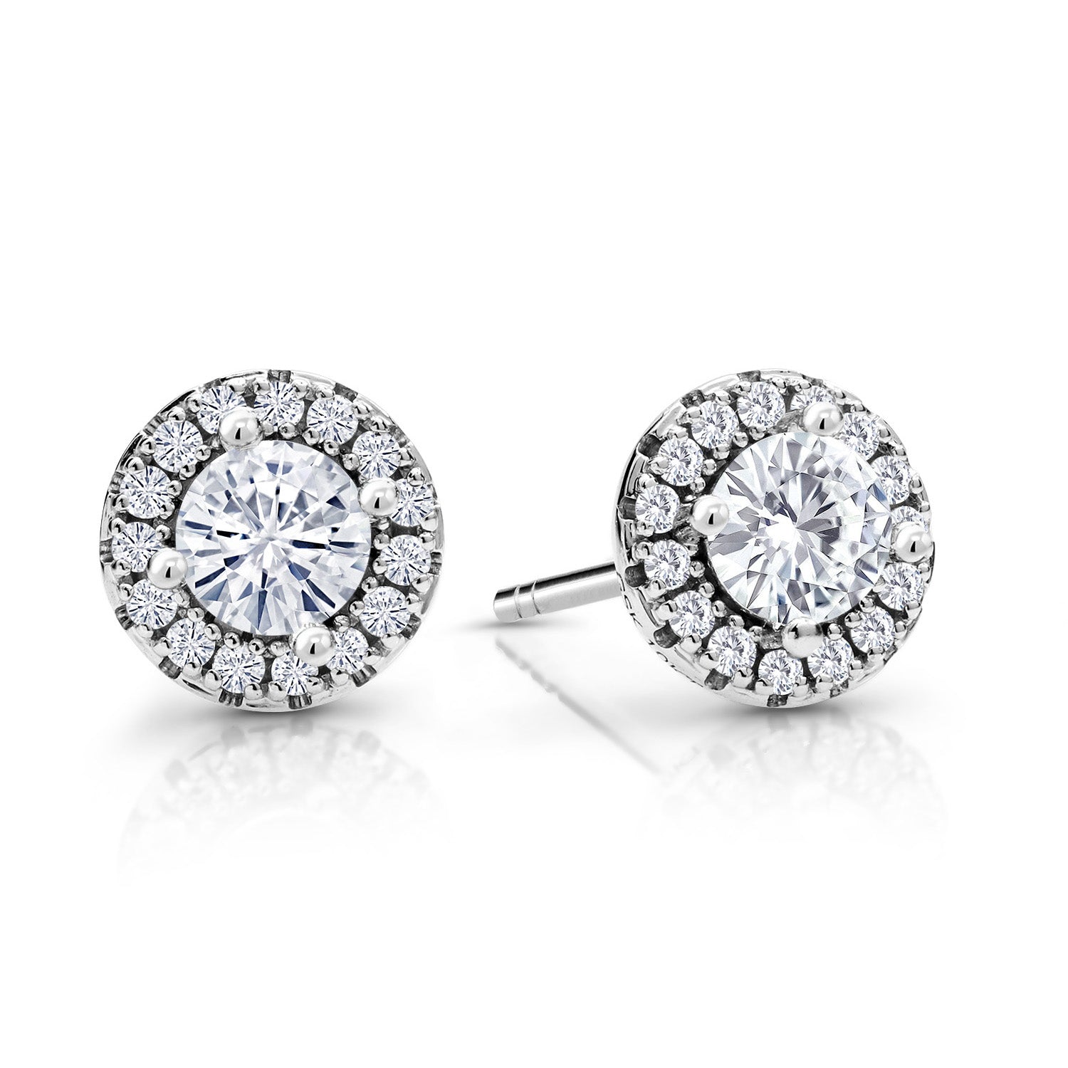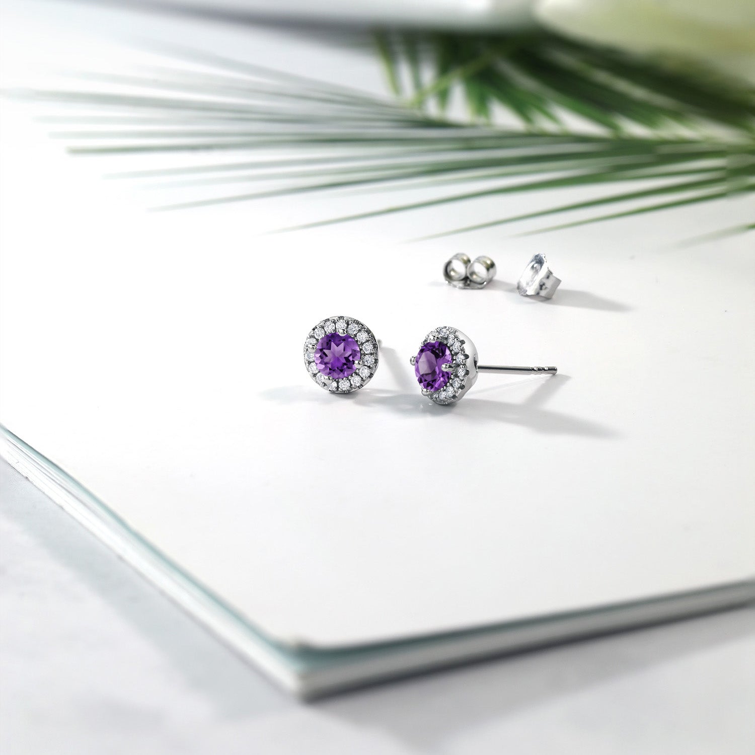10K White Gold 4MM Round Gemstone Birthstone and White Lab Grown Diamond Halo Earrings | Gold Earrings For Women