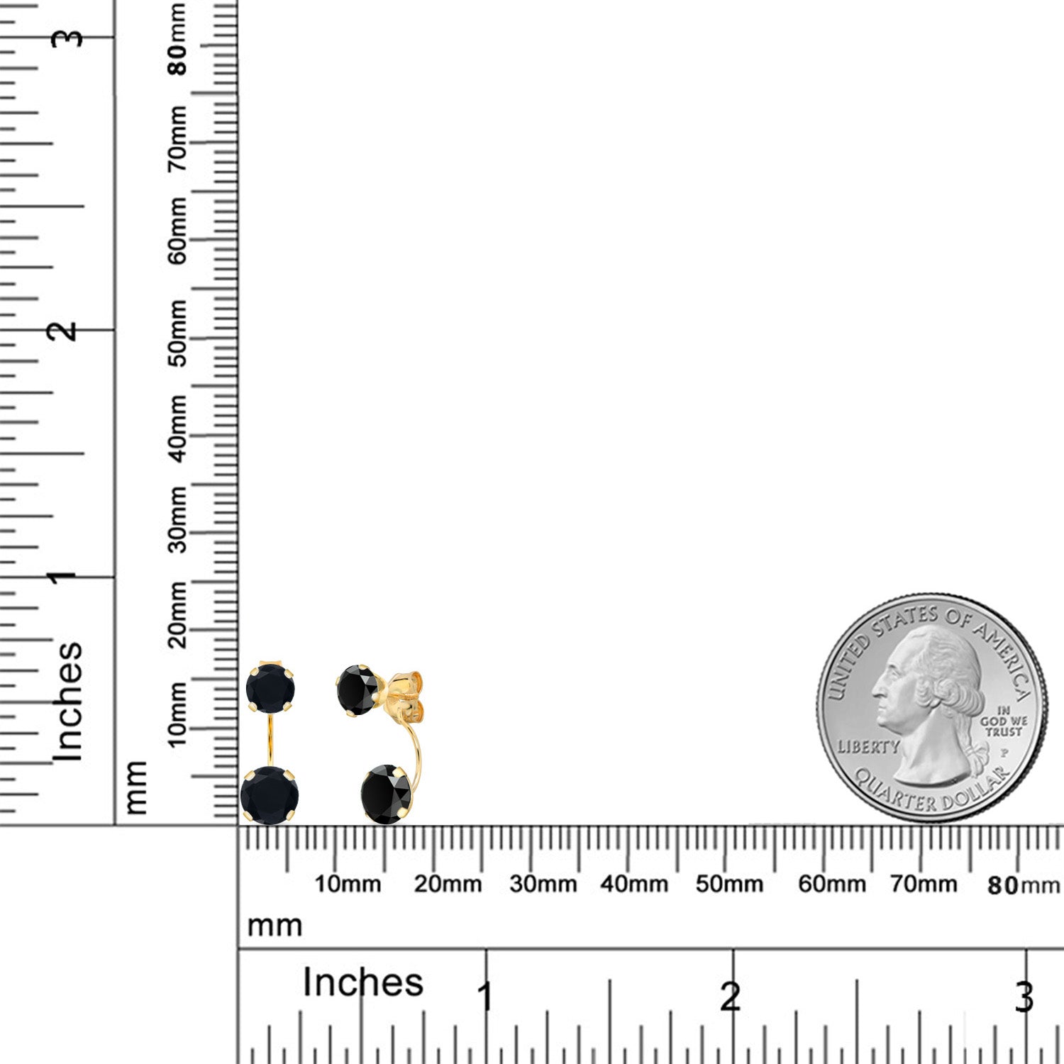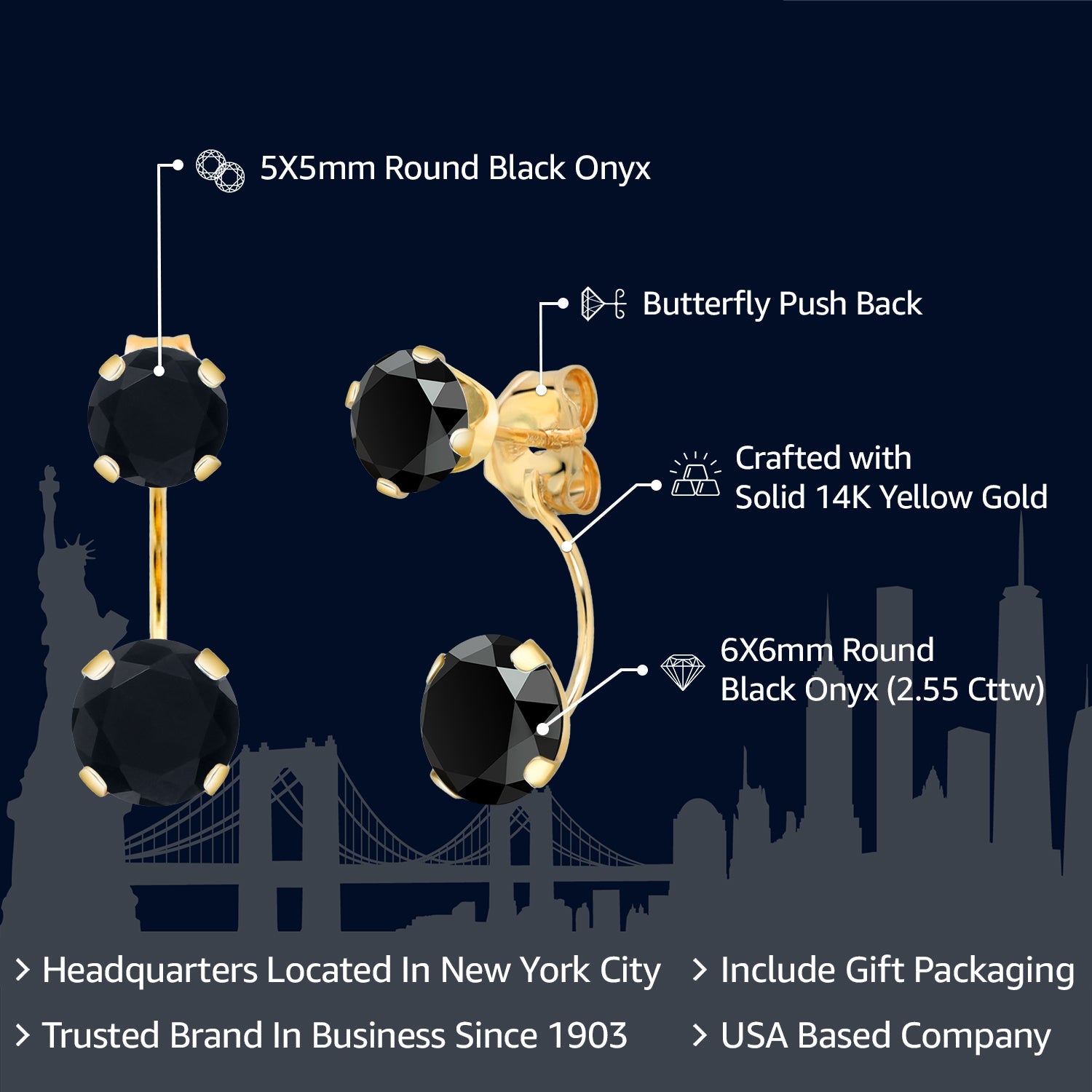 14K Yellow Gold Black Onyx Dual Drop 2 Stone Round Earrings for Women (2.55 Cttw, Gemstone Birthstone, Round 6MM and 5MM)