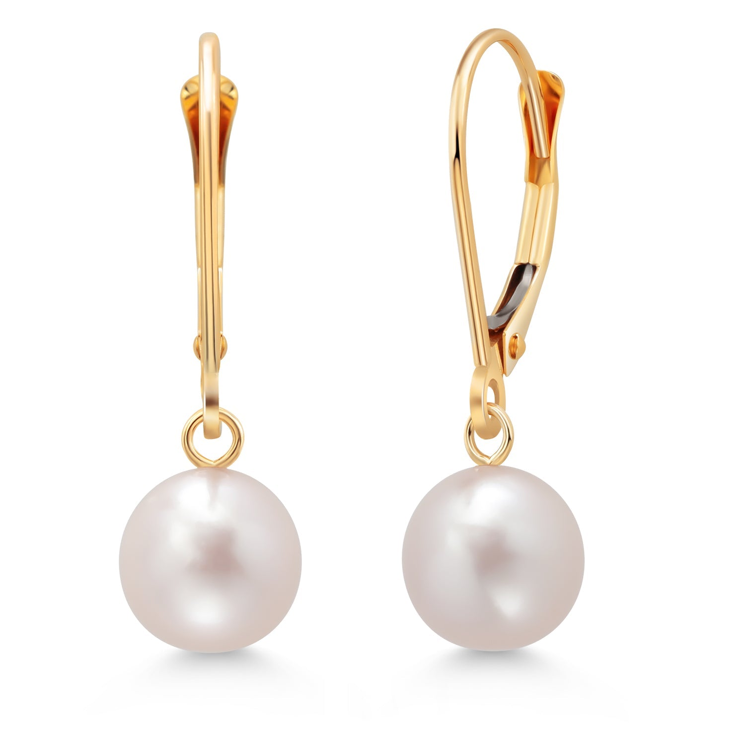 14K Yellow Gold Cultured Freshwater Pearl Earrings For Women, 7MM White Round Shape Dangling