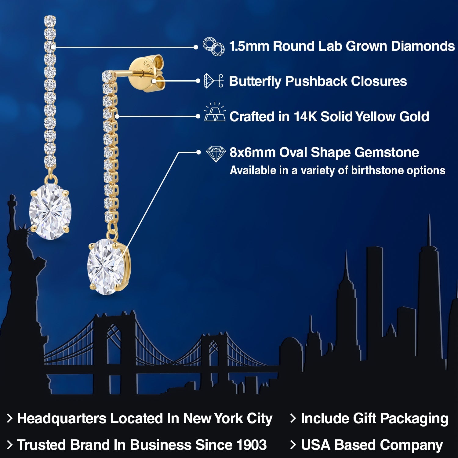 14K Yellow Gold Gemstone Birthstone and White Lab Grown Diamond Long Liner Dangle Earrings for Women | Oval Cut 8X6MM | Round 1.5MM | Yellow Gold Chain Drop Earrings