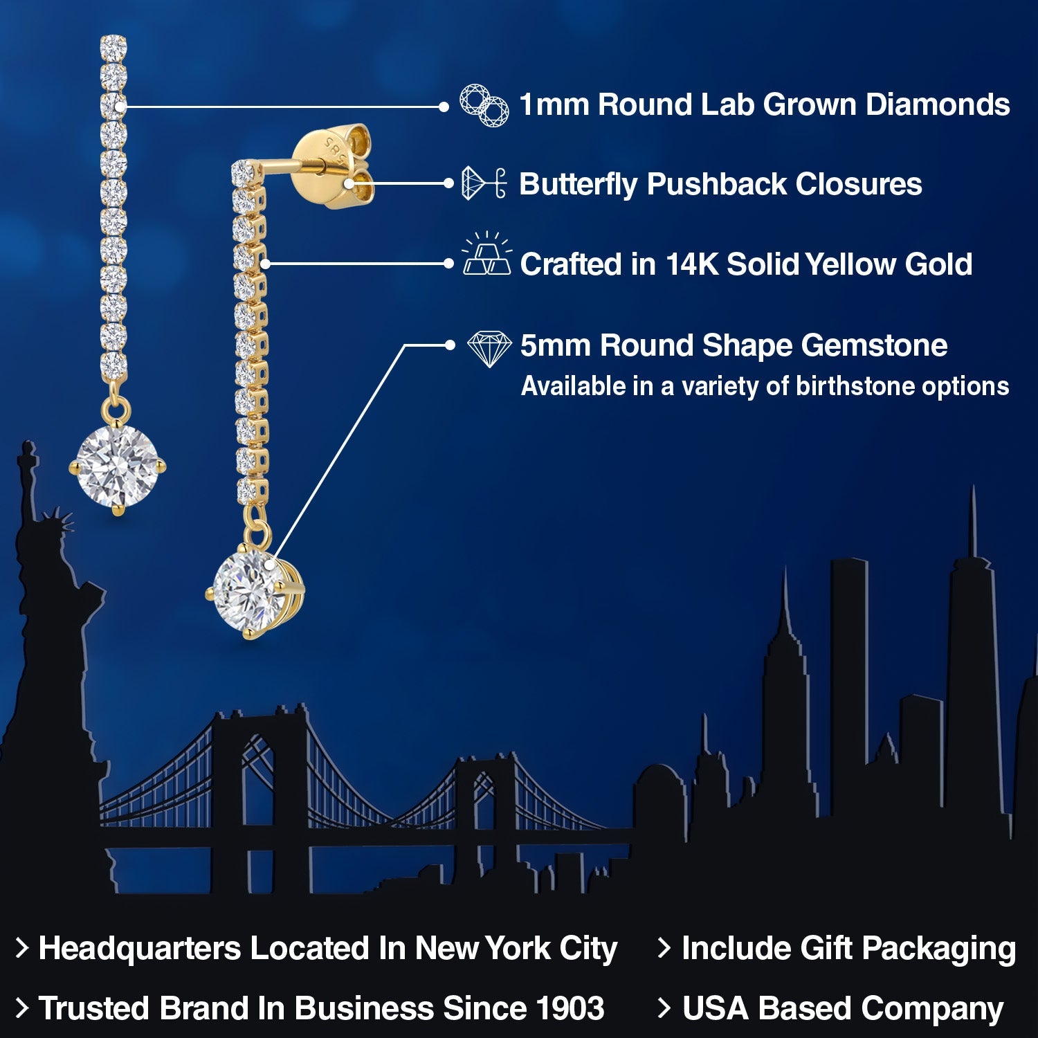 14K Yellow Gold Gemstone Birthstone and White Lab Grown Diamond Long Liner Dangle Earrings for Women | Round 5MM | Yellow Gold Chain Drop Earrings