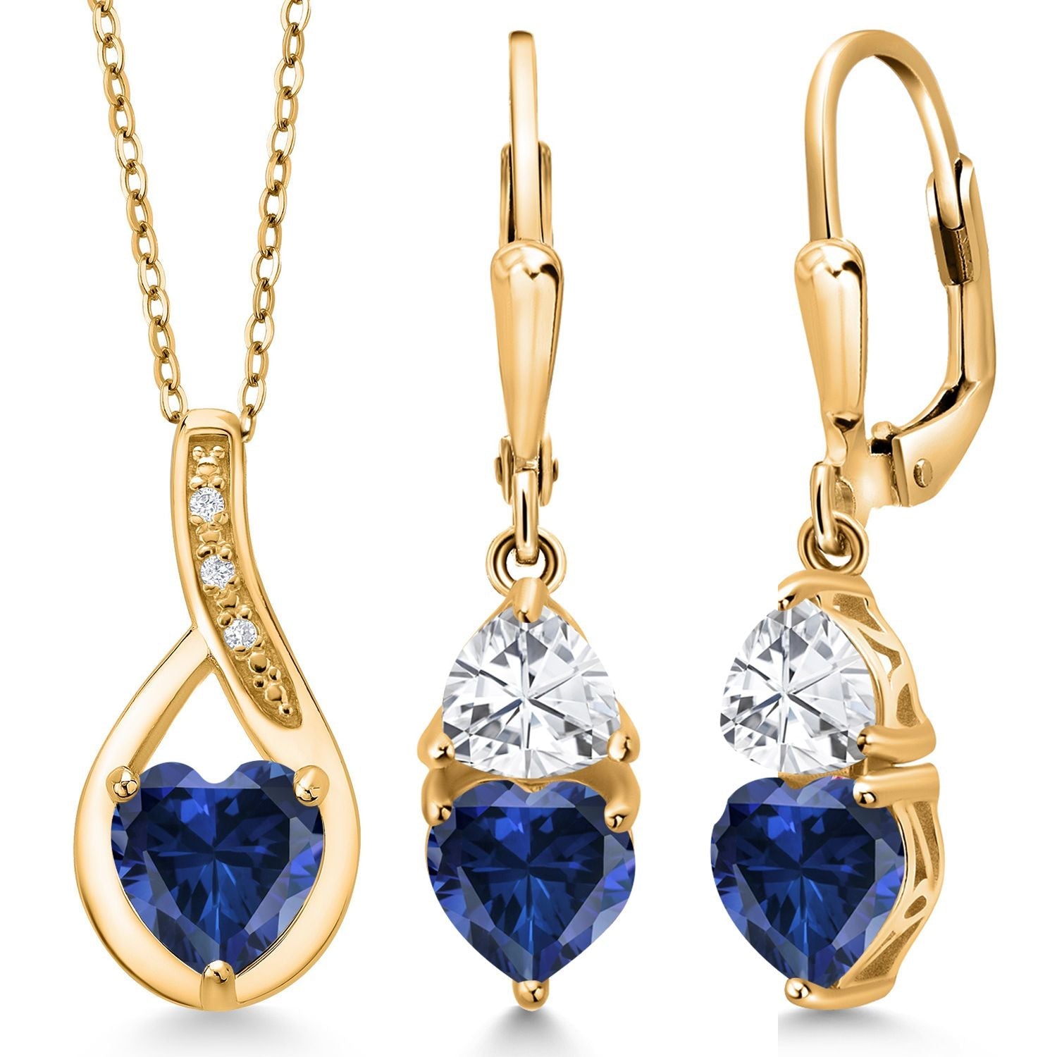 18K Yellow Gold Plated Silver Blue Created Sapphire Pendant Earrings Set For Women (4.24 Cttw, Gemstone September Birthstone, with 18 Inch Chain)