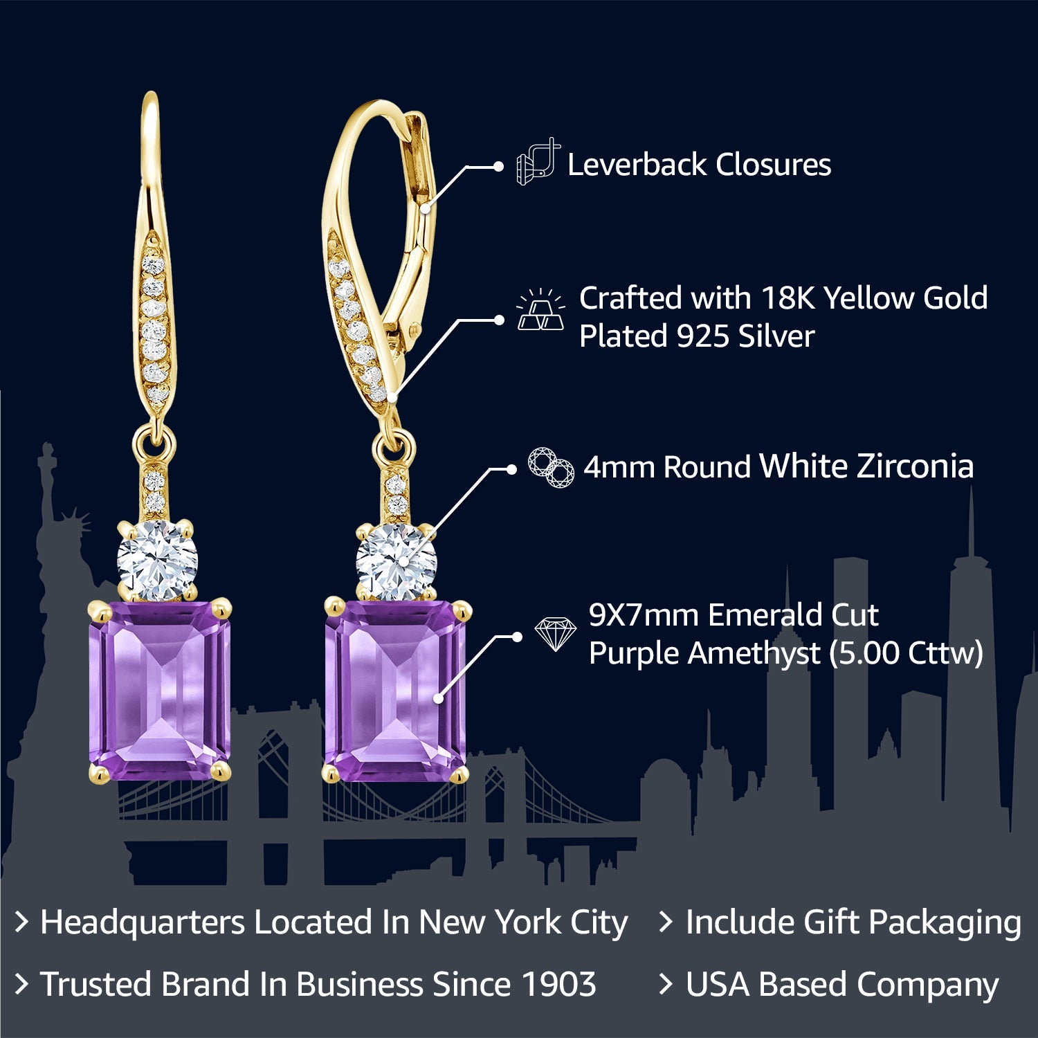 18K YELLOW GOLD PLATING: The earrings are expertly crafted with an 18K yellow gold plating over genuine silver, offering a radiant finish and unmatched durability. This luxurious layering not only enhances the look of the gemstones but provides a warm, classic hue that complements any skin tone. The 18K gold plating also adds a layer of protection, ensuring the earrings remain a cherished part of any collection for years to come.
