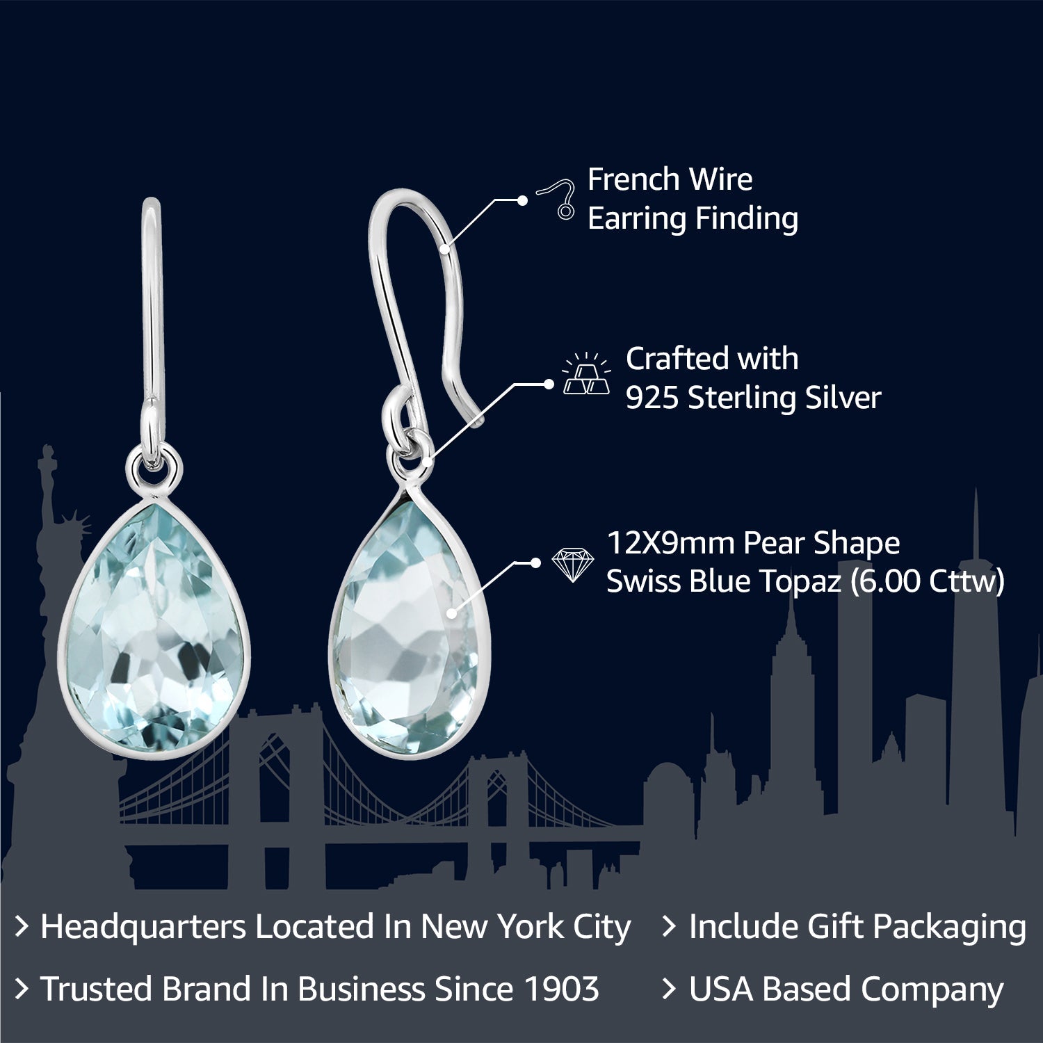 6.00 Cttw Swiss Blue Topaz Earrings In 925 Sterling Silver | Pear Shaped 12X9MM | Gemstone Birthstone | Drop Dangle Teardrop Earrings For Women