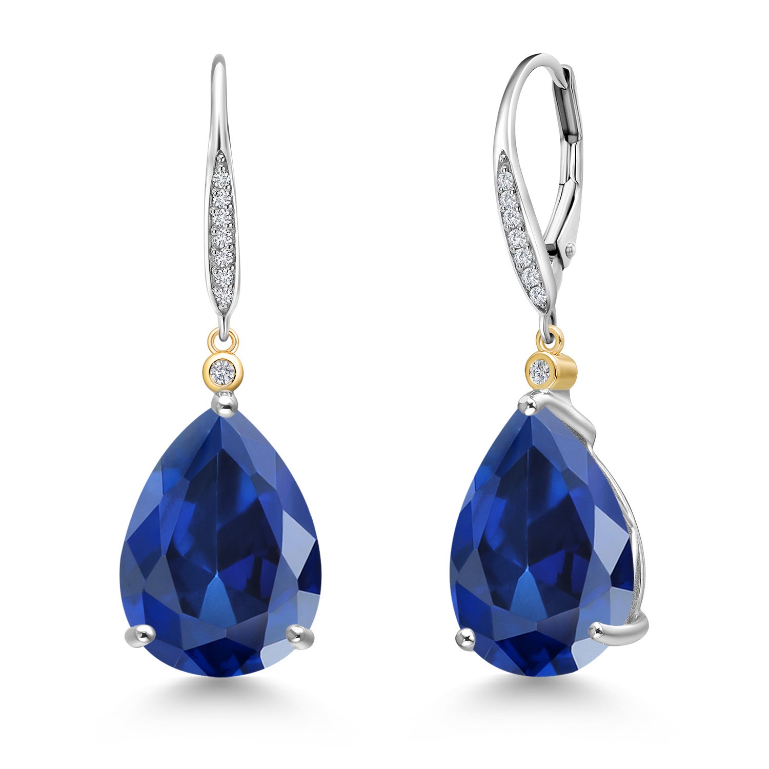 925 Silver and 10K Yellow Gold Blue Created Sapphire and White Lab Grown Diamond Dangle Earrings For Women | 20.43 Cttw | Gemstone September Birthstone | Pear Shape 16X12MM