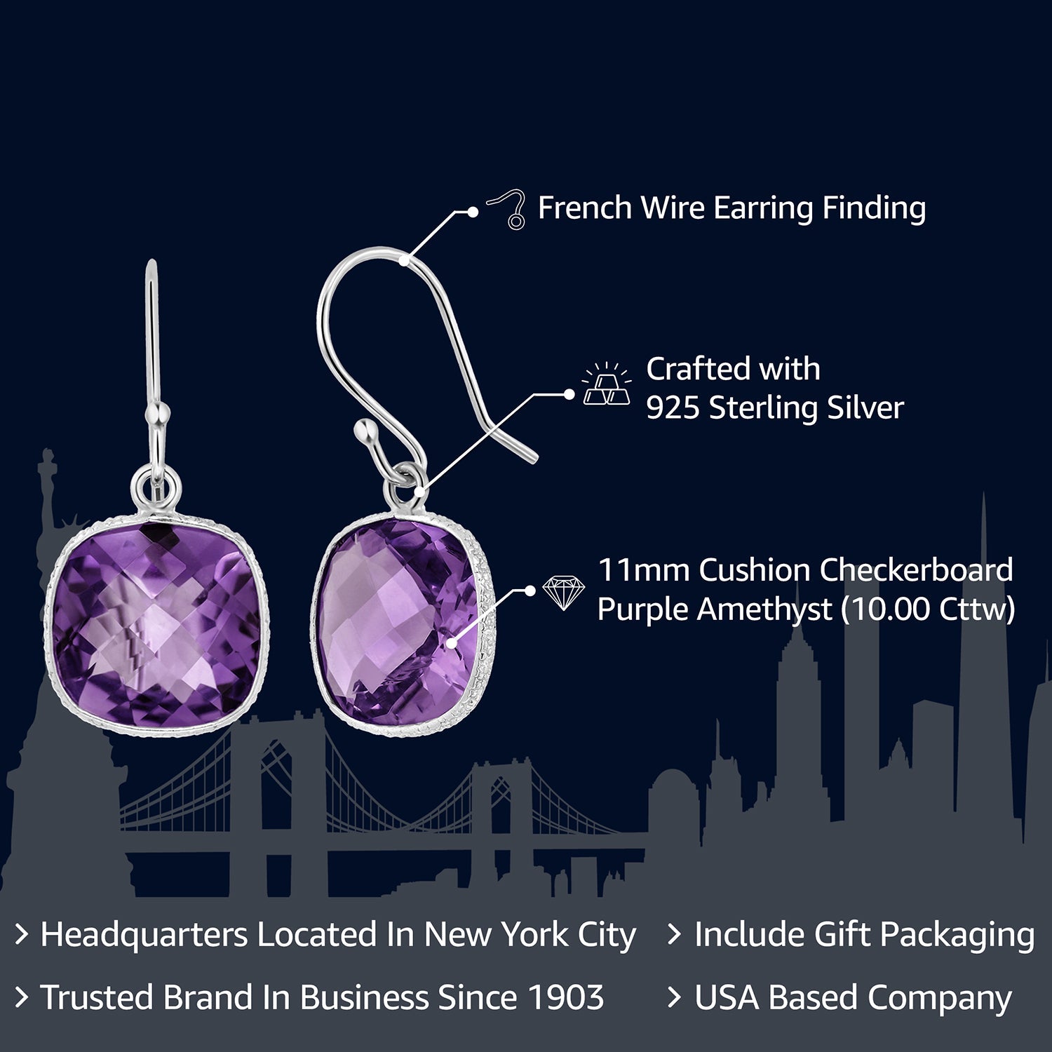 925 Sterling Silver Amethyst Drop Dangle Earrings For Women | 10.00 Cttw | Gemstone Birthstone | Cushion Checkerboard 11MM