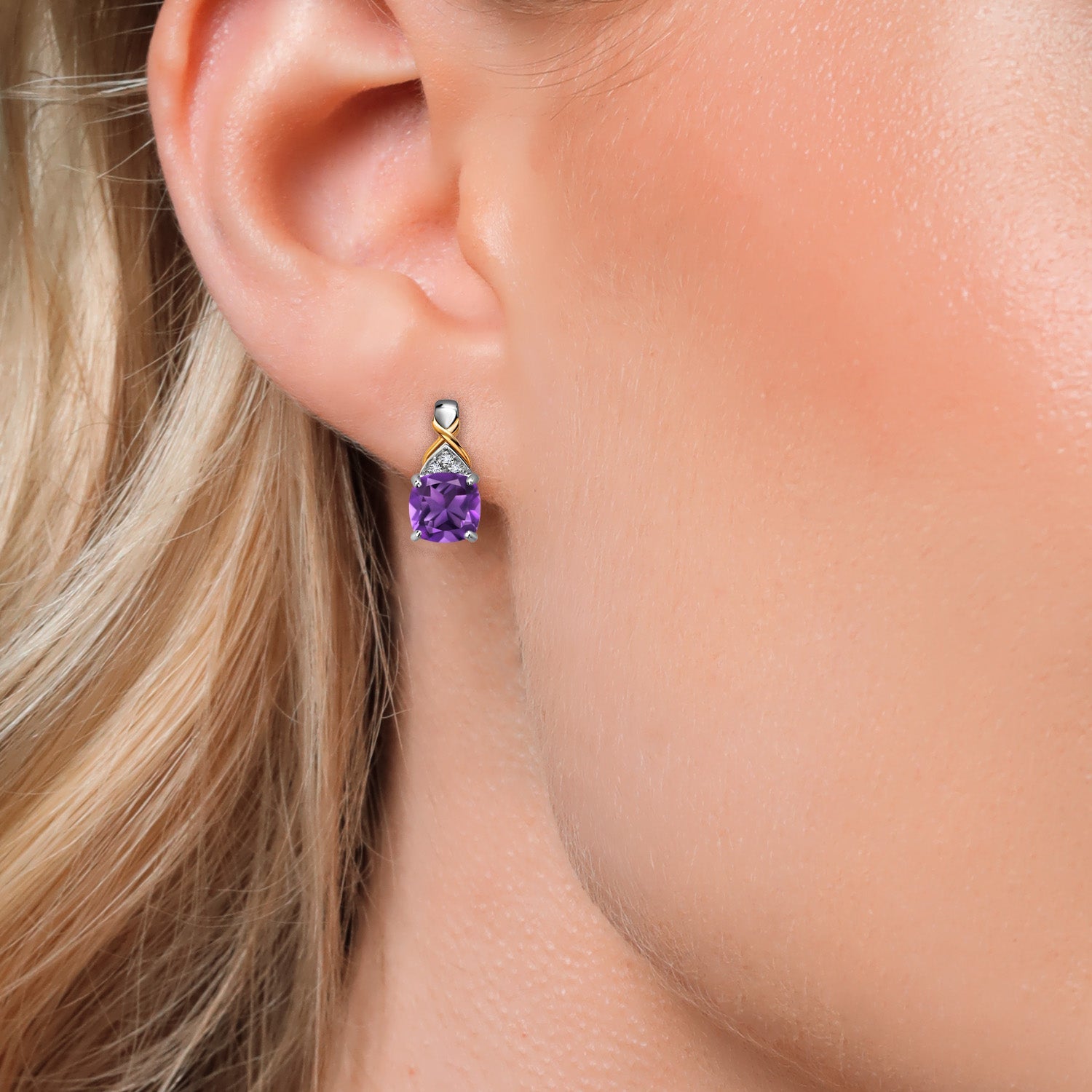 925 Sterling Silver and 10K Yellow Gold 6MM Cushion Gemstone Birthstone and White Lab Grown Diamond Earrings For Women