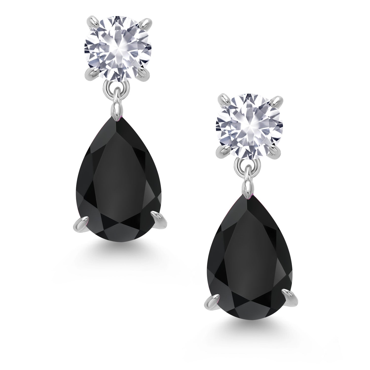925 Sterling Silver Black Onyx and White Created Sapphire Teardrop Dangle Drop Earrings For Women (7.54 Cttw, Gemstone Birthstone, Pear Shape 12x8MM, Round 6MM)