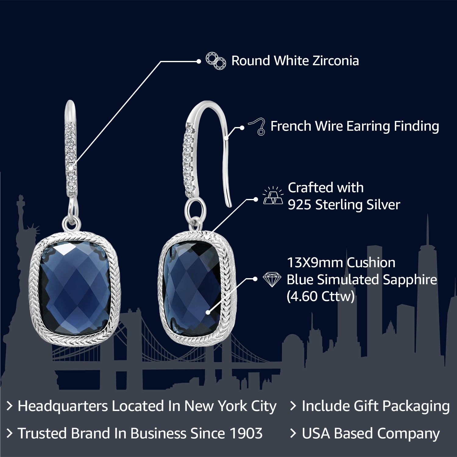 Blue Simulated Sapphire Drop Dangle French Wire Earrings For Women | 925 Sterling Silver | 13X9MM Cushion Checkerboard Cut | 4.60 Cttw