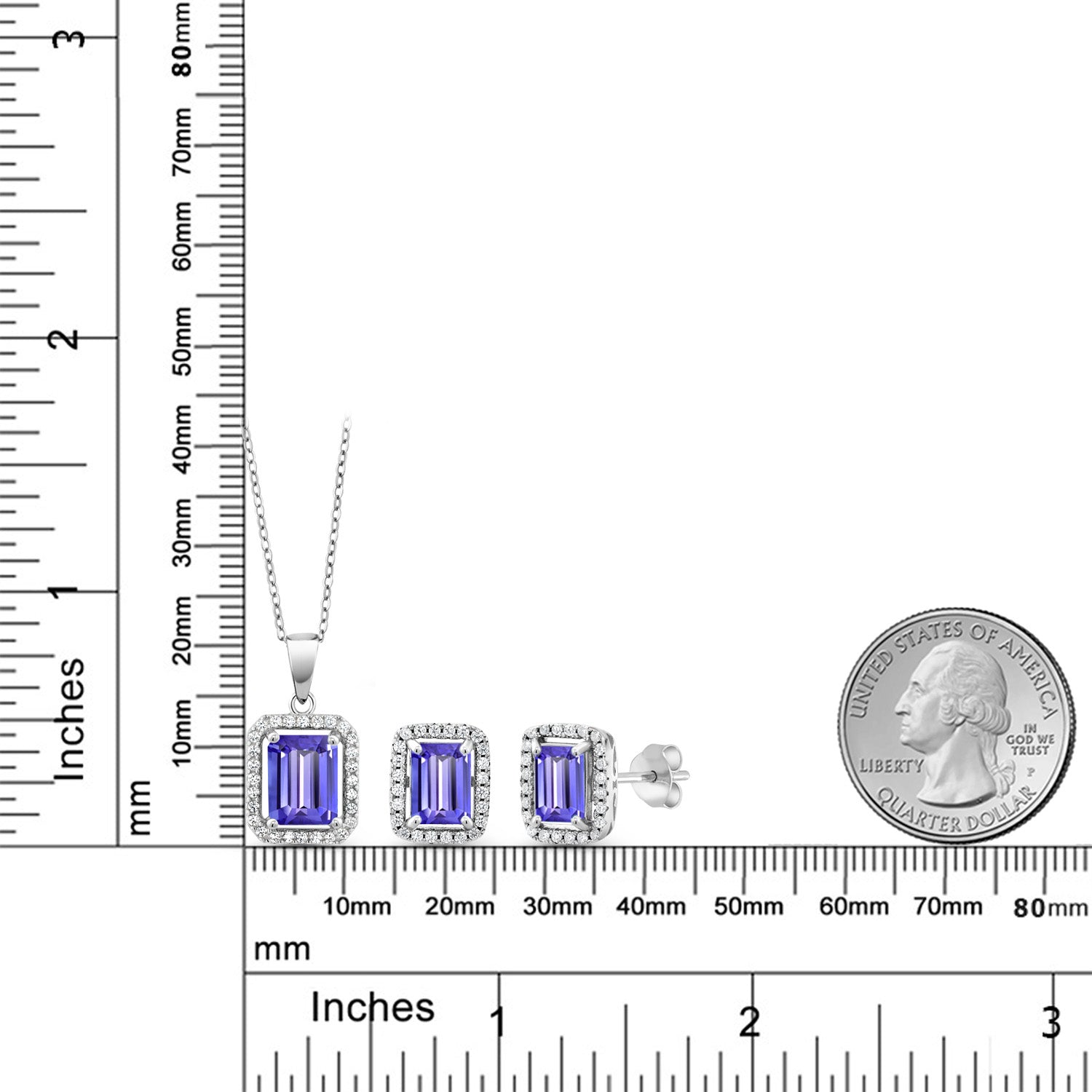 9X7MM and 8X6MM Emerald Cut Gemstone Birthstone Halo Pendant and Halo Earrings Jewelry Set For Women | 925 Sterling Silver | With 18 Inch Silver Chain