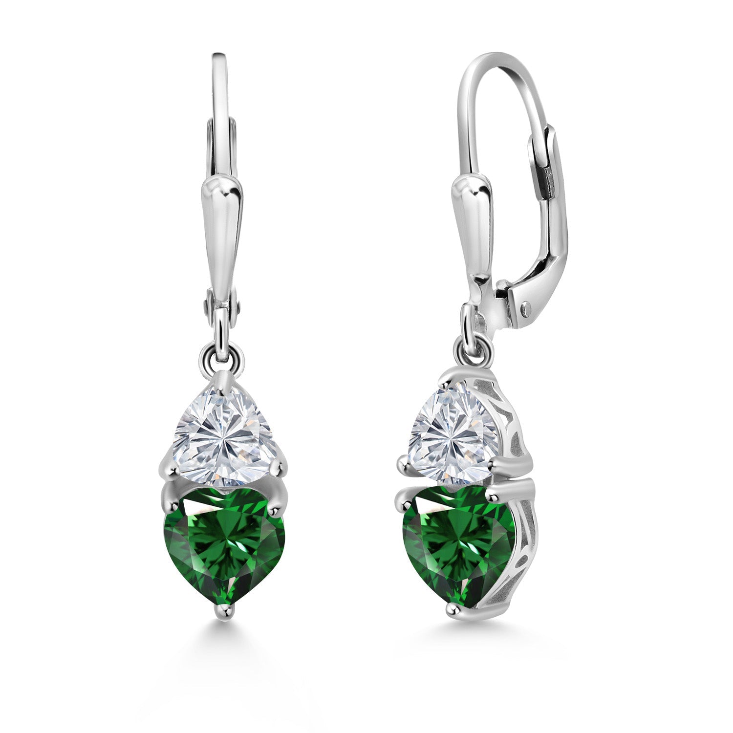 925 Sterling Silver Green Nano Emerald and Lab Grown Diamond Earrings for Women | 2.14 Cttw | Gemstone May Birthstone | Heart Shape 6MM