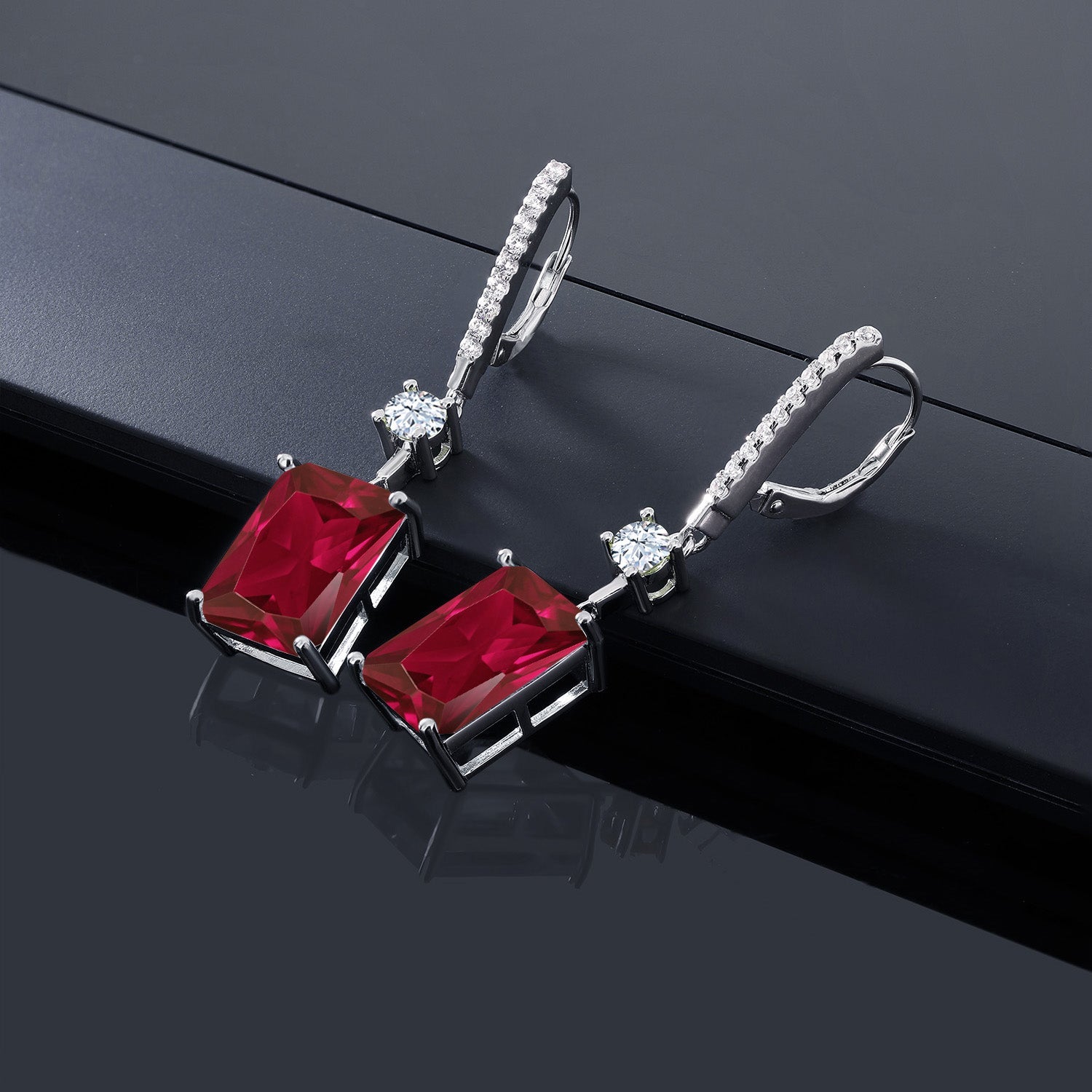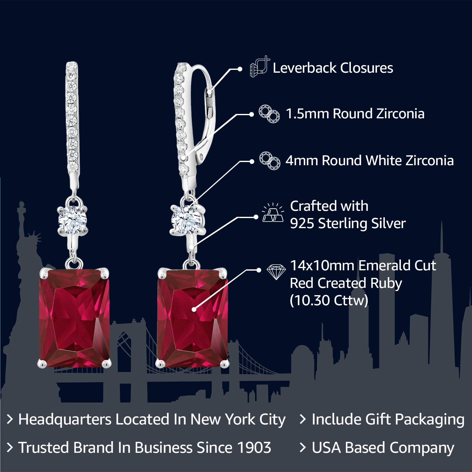 925 Sterling Silver Red Created Ruby Dangle Earrings For Women (10.30 Cttw, Emerald Cut 14X10MM)