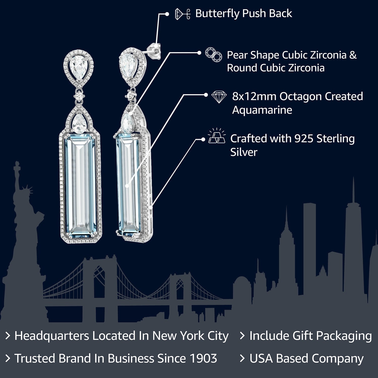 925 Sterling Silver Simulated Aquamarine Art Deco Dangle Earrings For Women (12.00 Cttw, 2 Inch)