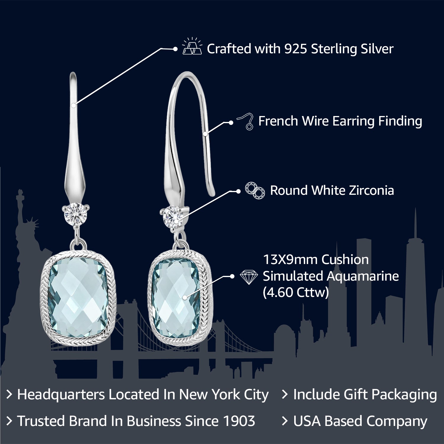 925 Sterling Silver Simulated Aquamarine Earrings | 4.60 Cttw | 13X9MM Cushion Checkerboard Cut | Drop Dangle Earrings for Women