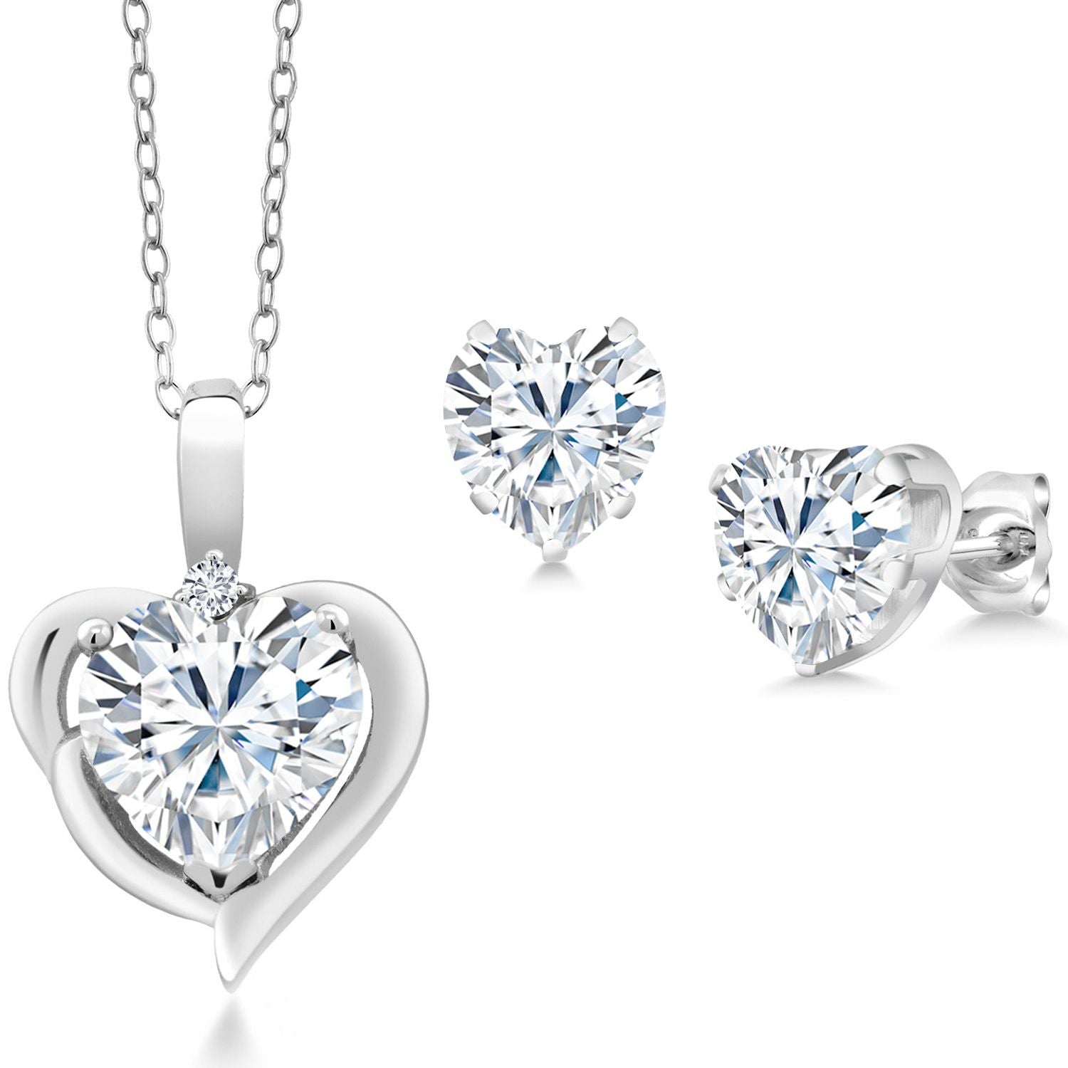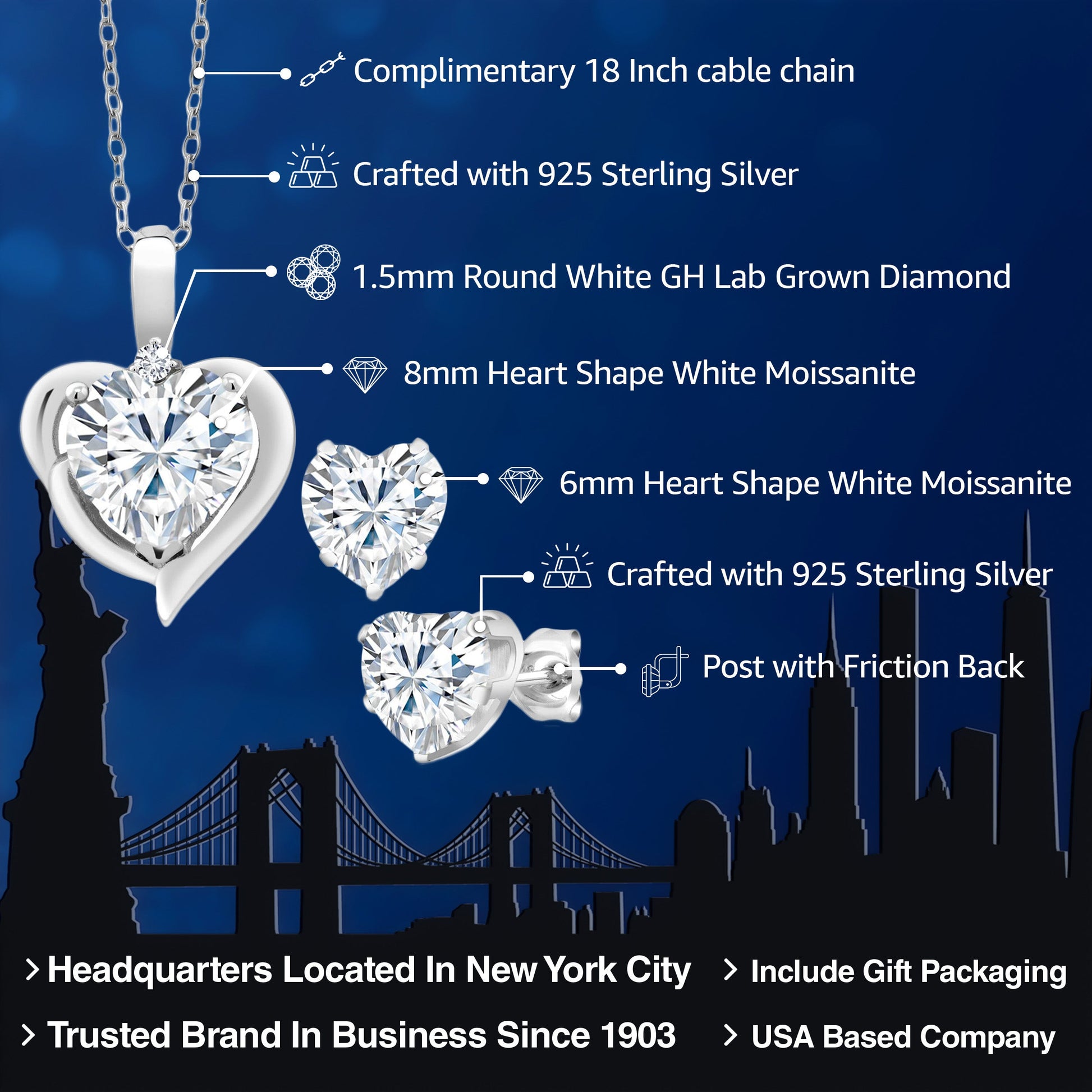 925 Sterling Silver White Moissanite and White Lab Grown Diamond Pendant Necklace Earrings Set For Women (3.42 Cttw, Heart Shape 8MM and 6MM, with 18 Inch Chain)
