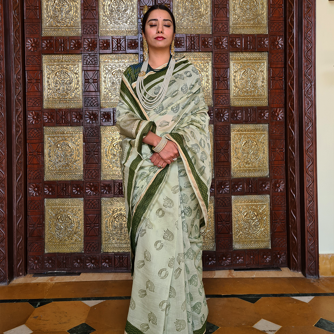 - Description: Light Green Chanderi Handloom Saree with Dark Green Handblock Print. This graceful Chanderi handloom saree features a soft light green base, adorned with detailed dark green handblock prints. The motifs, inspired by Tribal Gond art, showcase stylized fish—symbols often associated with nature, harmony, and cultural storytelling. Woven in fine Chanderi fabric, the saree is lightweight, breathable, and offers an elegant drape, making it a perfect choice for both everyday elegance and special occasions. Comes with a matching blouse piece.