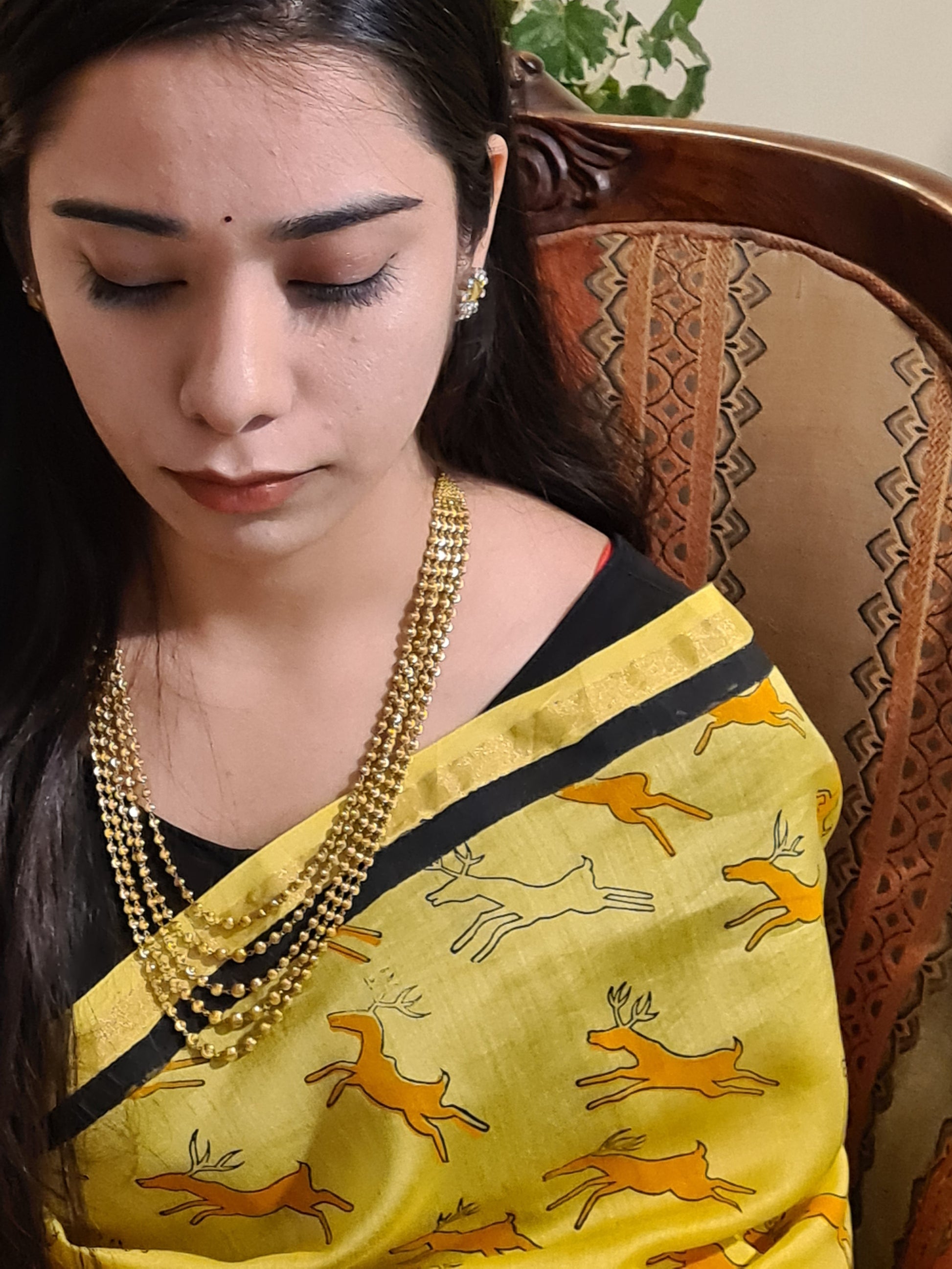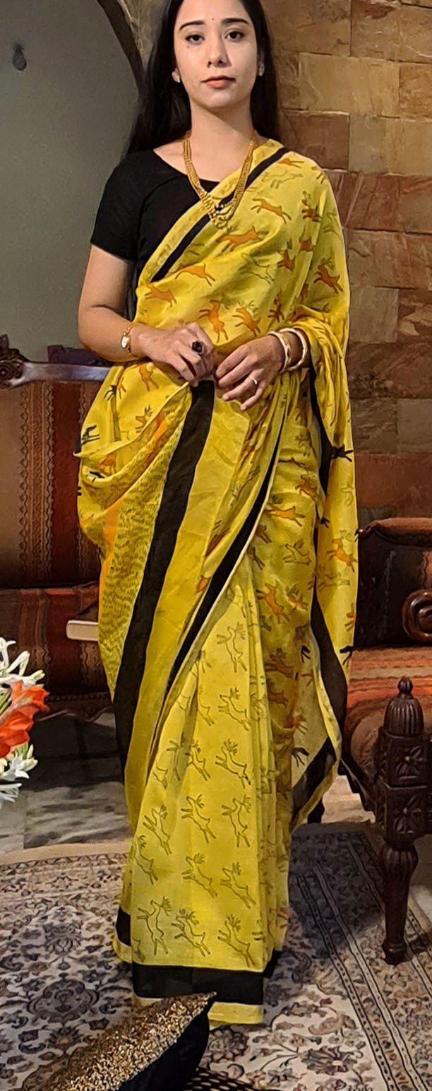 - Description: Yellow Chanderi Handloom Saree with Black Handblock Print Bright and elegant, this yellow Chanderi handloom saree features striking black handblock prints of stylized deer motifs. The design draws from traditional craftsmanship, adding a touch of cultural charm to the contemporary silhouette. Made from lightweight and breathable Chanderi fabric, it offers a soft texture and fluid drape—perfect for festive occasions, daytime functions, or graceful everyday wear. Includes a matching blouse piece.