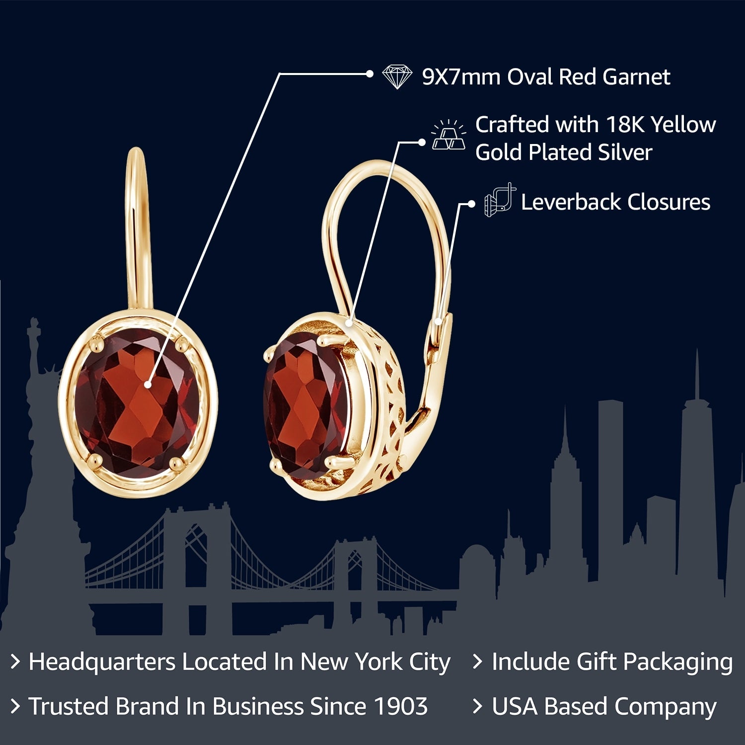 Red Garnet 18K Yellow Gold Plated Silver Dangle Earrings For Women (3.60 Cttw, Gemstone Birthstone, Oval 9X7MM)